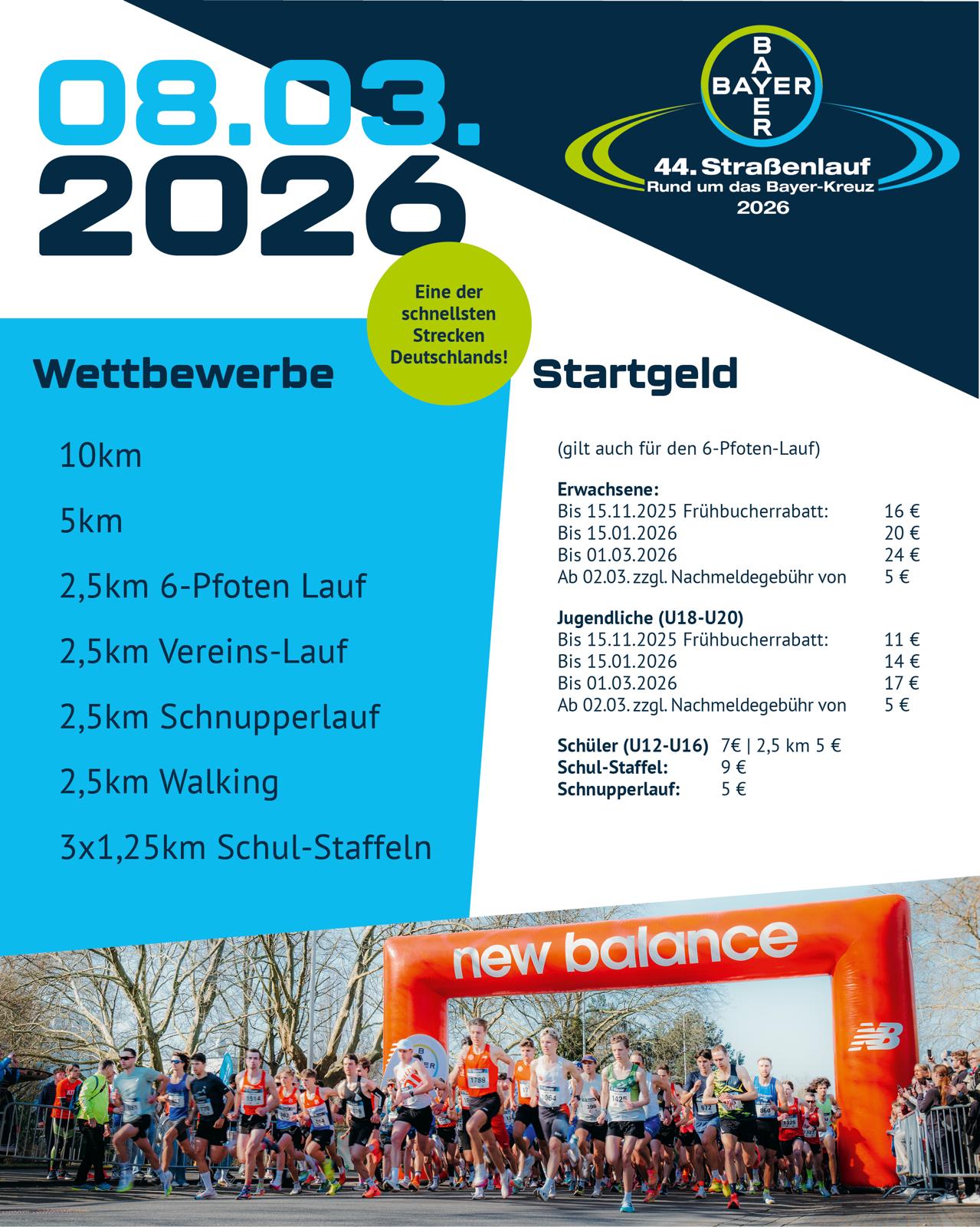 seid dabei beim 44. Straßenlauf „Rund um das Bayer-Kreuz“! Am 08. März 2026 geht’s wieder rund auf einer der schnellsten und traditionsreichsten Strecken Deutschlands!