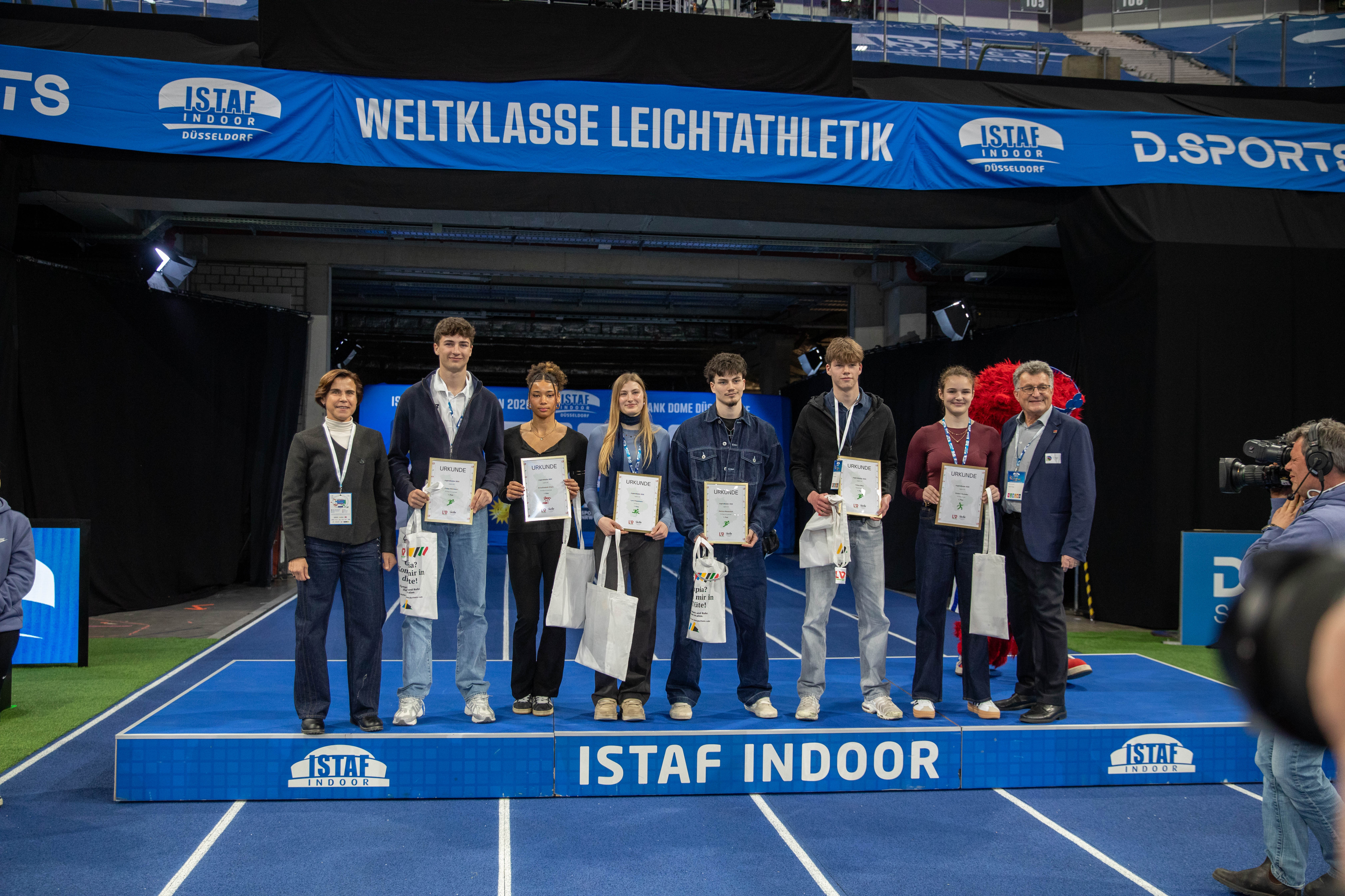 Auch unser Nachwuchs präsentierte sich im Vorprogramm sehr gut. Die U12-Staffel siegte beim Talent Cup in der Besetzung Lina Baklouti, Noel Eikermann, Diana Löffler, Johann Schmitz-Elvenich, Marie Deutz, Maximilian Kutz, Emma Sportman, Mathis Westhoff, Enja Kahan und Jan Schutzmajer in 2:48,90 Min. Zudem qualifizierte sich Lukas Börnemeyer (M12) für das 60m Sprintfinale vom Talents Cup, erzielte eine neue Bestleistung und wurde in 9,09sek Elfter. Zudem wurden vom LVN die Jugendbesten des Jahres 2025 geehrt. Drei Leverkusener*innen gewann hierbei die Auszeichnung: Anna-Elisabeth Ehlers in der weiblichen U20, Philip Steinmann in der männlichen U20 und Gianluca Wessendorf in der männlichen U18. Erneut ein Zeichen der starken Jugend- und Nachwuchsarbeit im TSV.