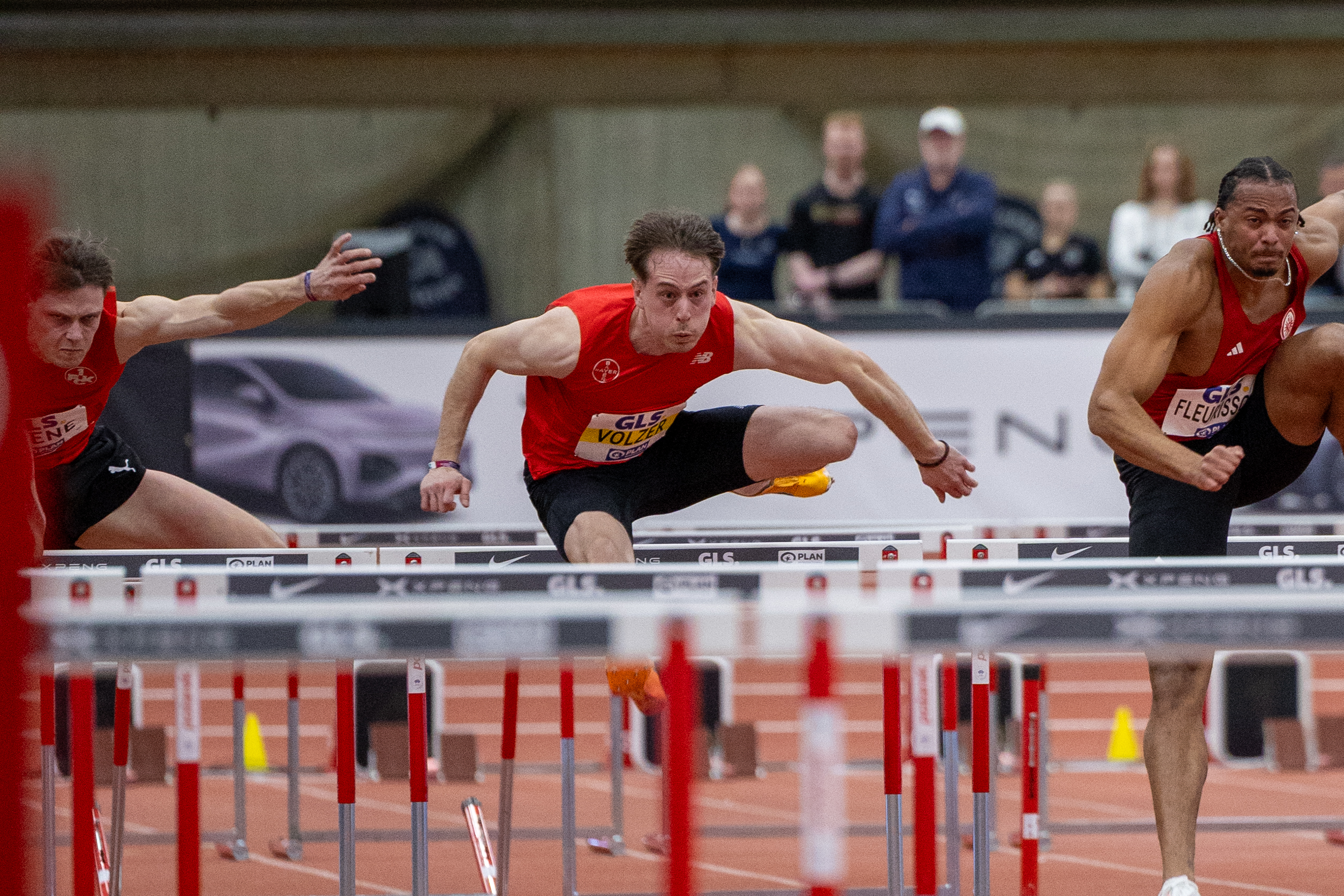 Über die 60 Meter Hürden der Männer ging Stefan Volzer mit seiner Vorleistung von 7,75sek favorisiert in den Wettbewerb. Nach den Ausfällen von Trainingskollege Tim Eikermann, Gregory Minoue (Tracksrunner Bonn) und Manuel Mordi (Hamburger SV) lief es auf ein Duell mit dem Frankfurter Zehnkämpfer Fred Isaac Fleurisson hinaus, der mit 7,80sek anreiste.
